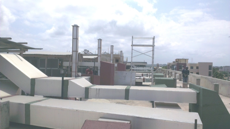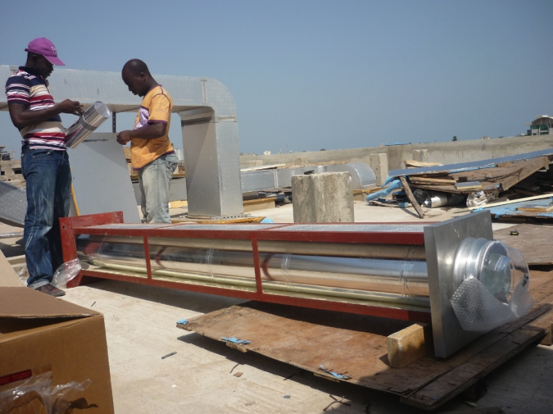 | Pose de 04 puits de lumière Solarspot 250 pour l'éclairage d'un couloir à la Clinique BIASA de Lomé (2013-2015). Quatre (04) mètres de tubes de rallonge pour placer le capteur au-dessus de l'apatame (à construire) afin de bien capter les rayons lumineux du soleil. |