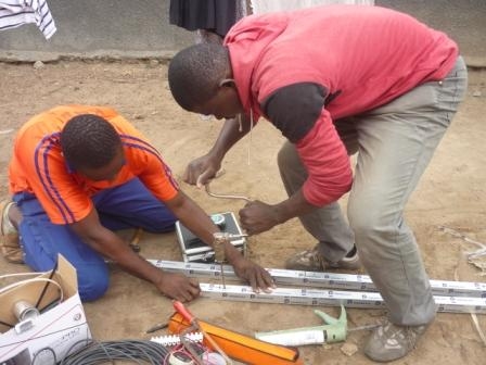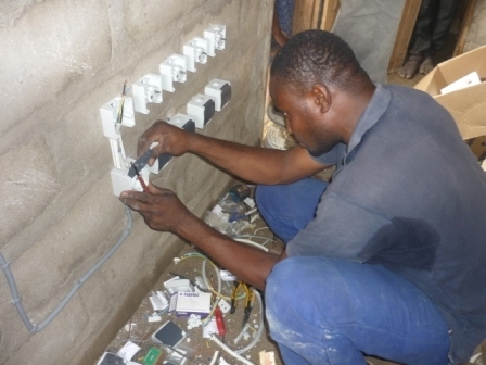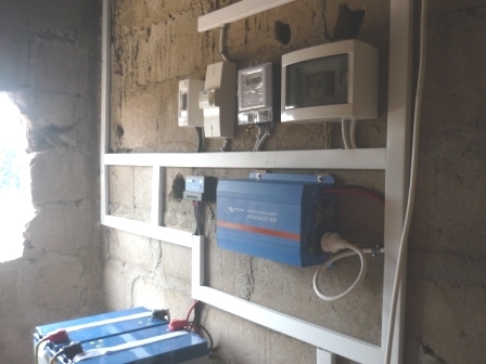Installation solaire pour alimenter une station de charge de téléphones portables et éclairage dans un village.