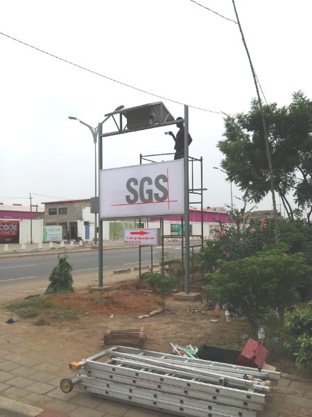 Installation d’une enseigne lumineuse autonome sur la route internationale Lomé-Cotonou au niveau de Baguida. Le système solaire alimente l’éclairage de l'enseigne pendant la nuit. Un dispositif allume et éteint automatiquement l'enseigne.