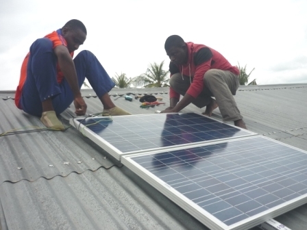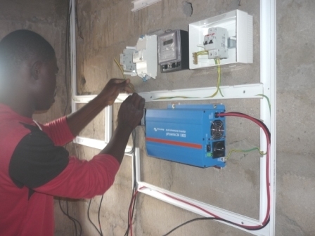 Installation solaire pour alimenter une station de charge de téléphones portables et éclairage dans un village.